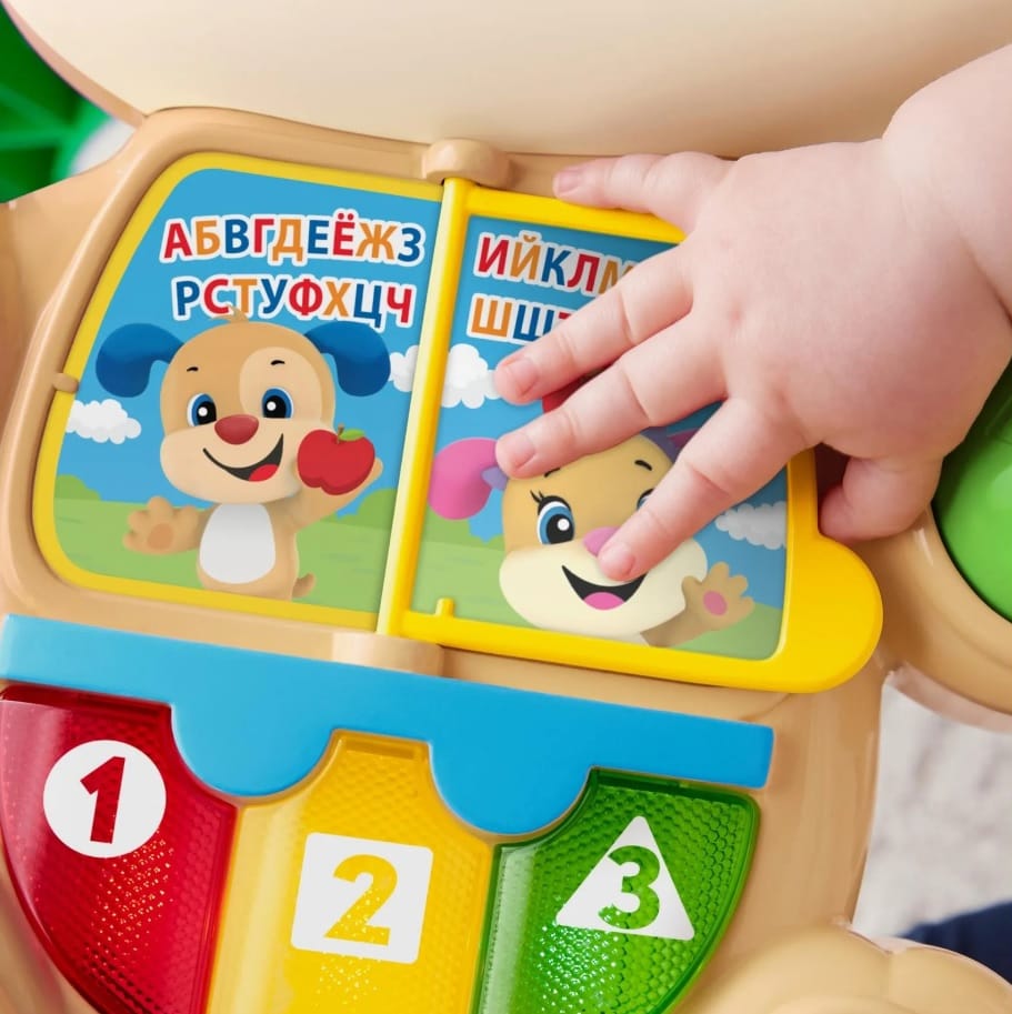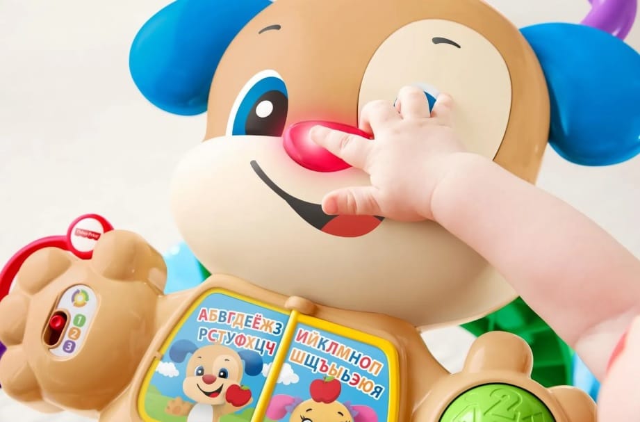 Интерактивный щенок реагирует на движения и нажатия: включает музыку, загорается огоньками и произносит обучающие фразы. По мере роста малыша игрушка знакомит его с буквами алфавита, цифрами, цветами, фигурами и простыми английскими словами.