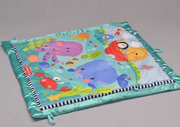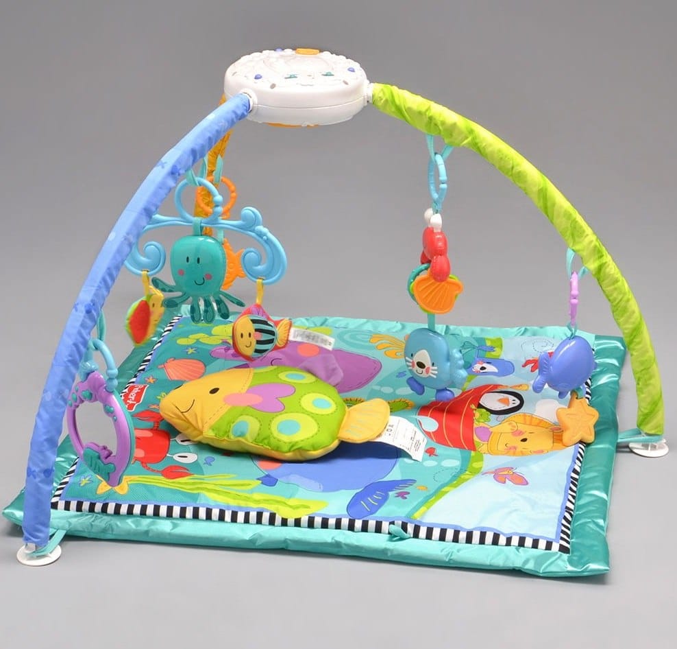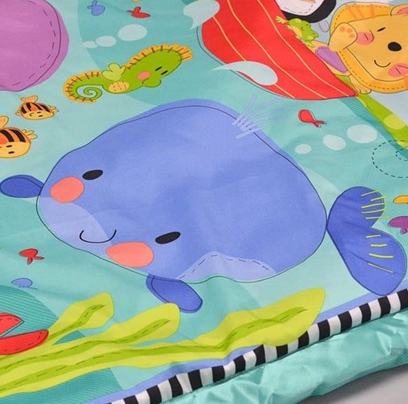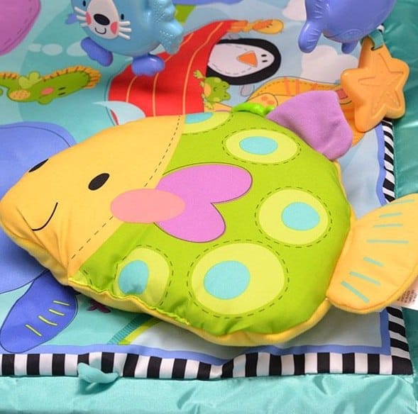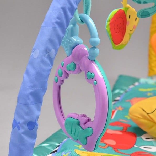 Развивающий коврик выполнен из яркой ткани в цветах водного мира с изображением морских обитателей. Состоит из нескольких частей, каждая из которых отличается по фактуре материала, что способствует развитию тактильных чувств у малыша. Над ребенком возвышаются три дуги с подвесными игрушками, в центре скреплены музыкальной интерактивной панелью.