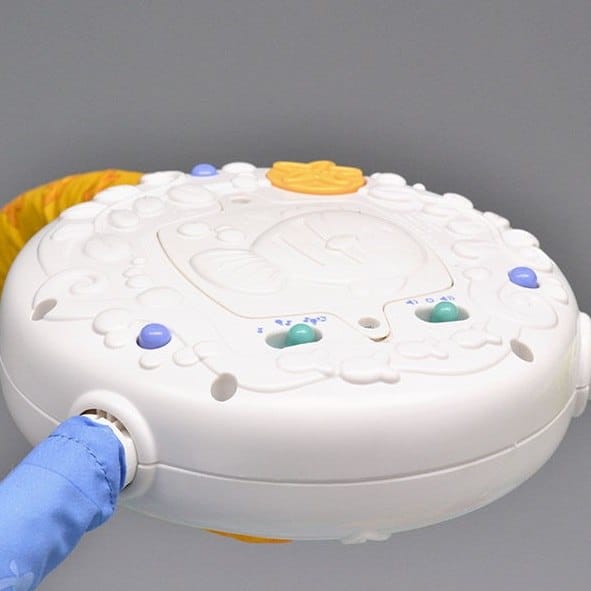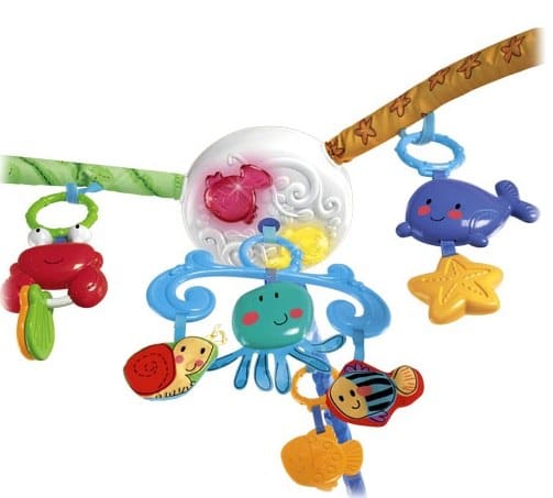 В комплектацию коврика входят: подвесная игрушка, которая является частью мобиля, состоит с пластиковой дуги голубого цвета с возможностью крепления на детскую коляску и игрушками — рыбка, улитка и осьминог.